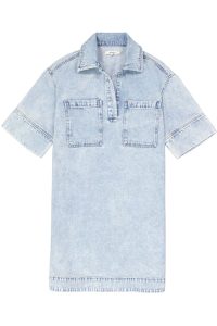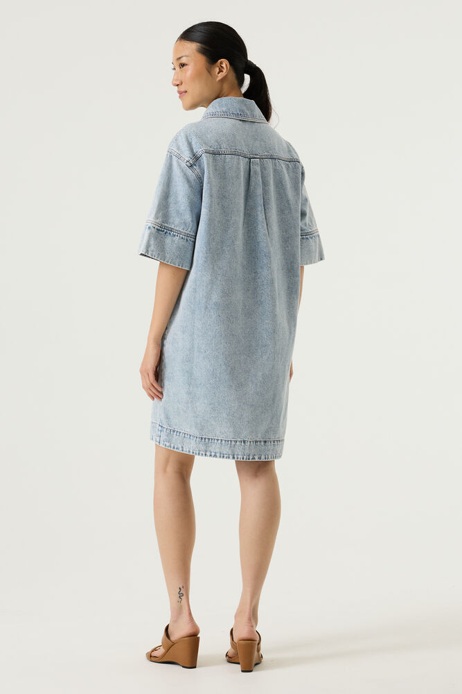 Denim jurk met borstzakken. Deze jurk heeft een knoopsluiting, korte mouwen en een relaxed fit. Dit item is gemaakt van 80% katoen en 20% gerecycled katoen.