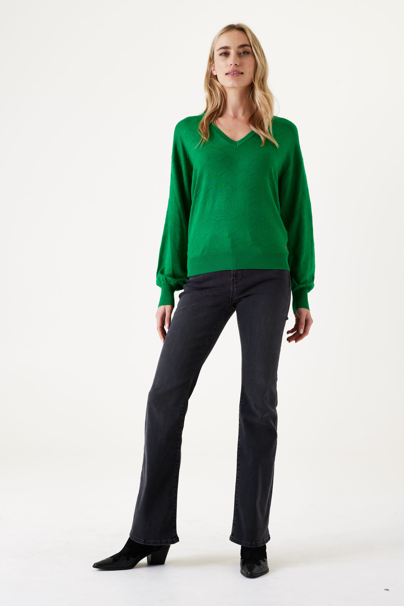 Trui met ingebreid patroon. Dit item is perfect voor het najaar. De trui heeft een V-hals, verlaagde schoudernaden en een regular fit. Dit item is gemaakt van 79% viscose en 21% polyester.